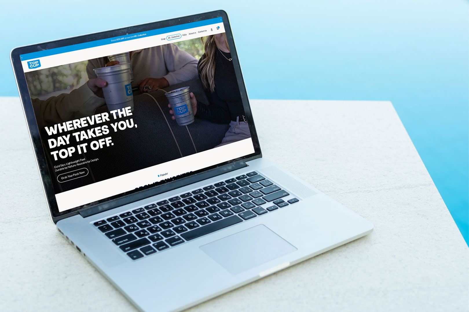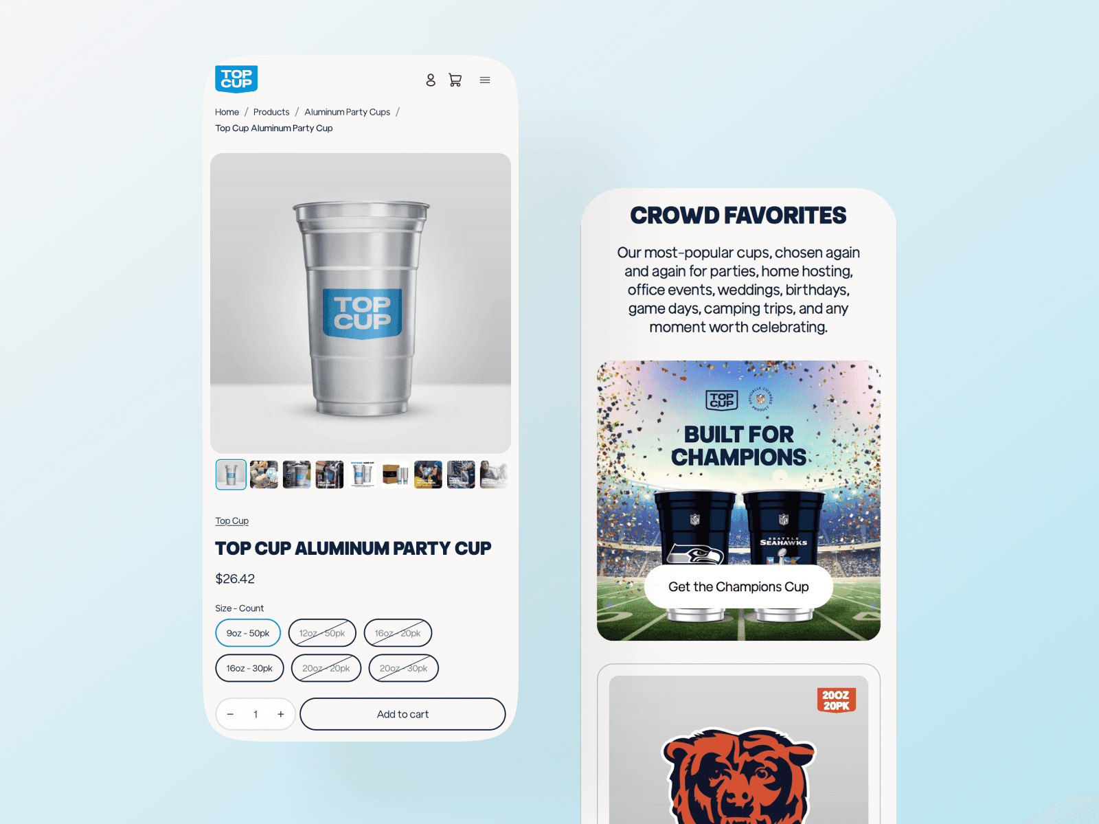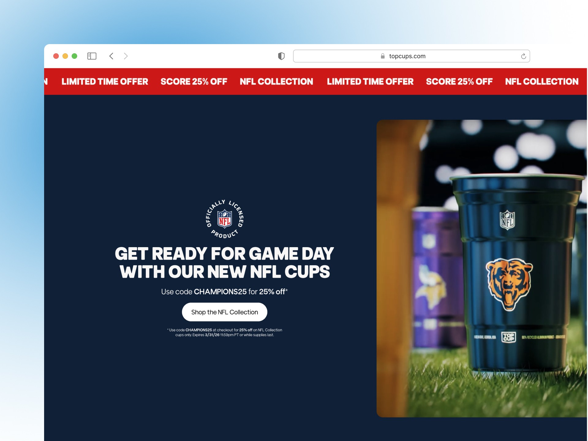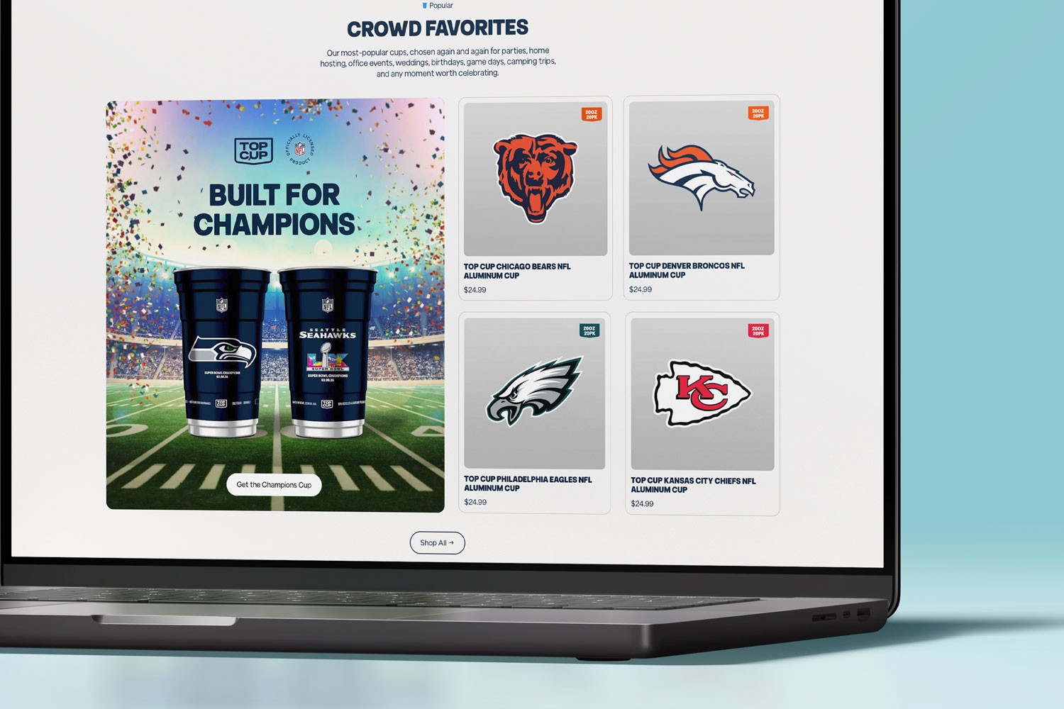 Top Cup manufactures reusable aluminum cups designed as a recyclable alternative to plastic party cups. After finding success on Amazon, I was hired by Victory Creative to design a Shopify storefront for their growing direct-to-consumer brand. After their store launch, they sold out of their licensed NFL products within one week.